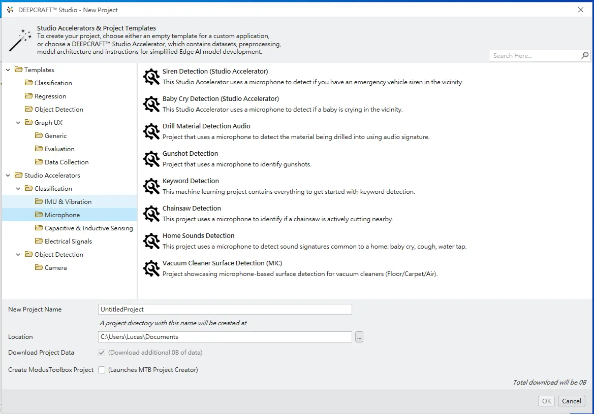 在 Studio Accelerators → Classification → Microphone 類別下,右側列出多個已定義好的音訊專案,例如 Siren Detection(警笛偵測)、Baby Cry Detection(嬰兒哭聲偵測)、Gunshot Detection(槍聲偵測)、Keyword Detection(關鍵字偵測)、Home Sounds Detection(家庭聲音偵測)等。每個專案都附帶資料集、前處理與模型架構,可直接用來快速建立聲音識別與環境音偵測的邊緣 AI 應用。