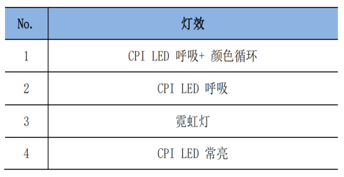 支援1顆RGB LED指示燈,顯示不同CPI顏色與特定的燈效。以下列舉