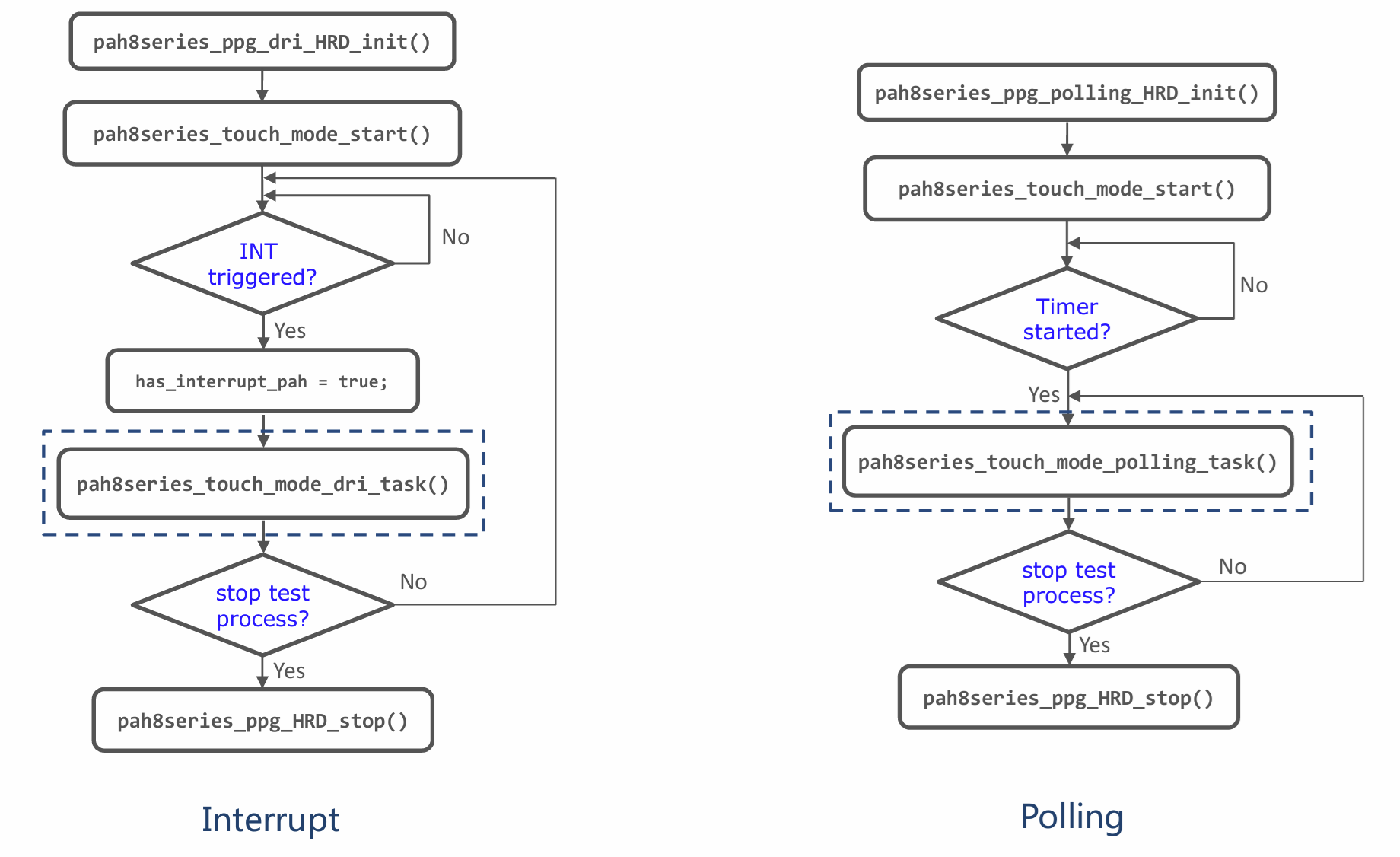 • HRD/SpO2測試停止後,如果需要持續監測Touch狀態,請調用以下指定函數,然後在pah8series_touch_mode_polling_task()或pah8series_touch_mode_dri_task()中通過pah_read_touch_flag(&touch_flag)獲取touch_flag值,以判斷設備是否有“佩戴”。