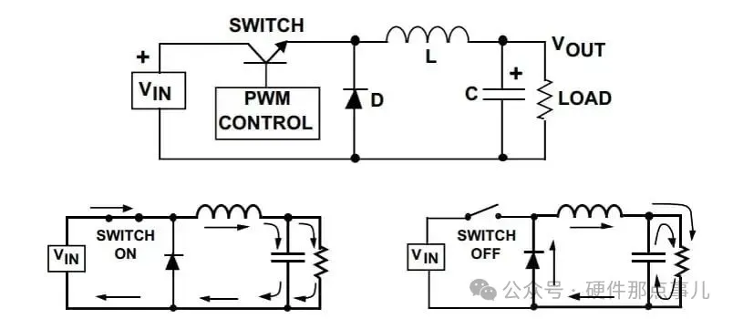 BUCK電路通常包括開關MOSFET、二極體、電感和電容。其工作過程分為兩個階段: