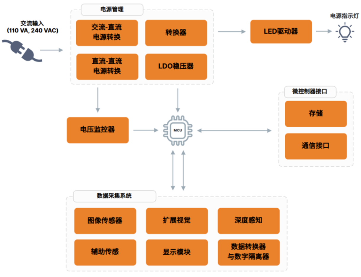 下面的框圖展示了採用安森美 (onsemi)推薦產品的機器視覺方案,該方案整合了多種影像感知和深度感知技術,運用了安森美的全域快門和卷簾快門感測器系列產品。電源管理、通訊等大多數功能模組元件均可從安森美的完整方案中獲取。