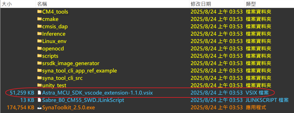 * 例如:您會找到一個名稱類似於 Astra_MCU_SDK_vscode_extension-1.1.0.vsix 的檔案。