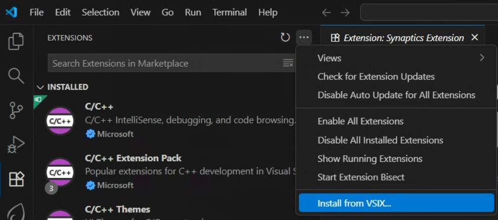 首先,請在您的 SDK 資料夾中找到 Synaptics VS Code 擴充功能的 VSIX 檔案。