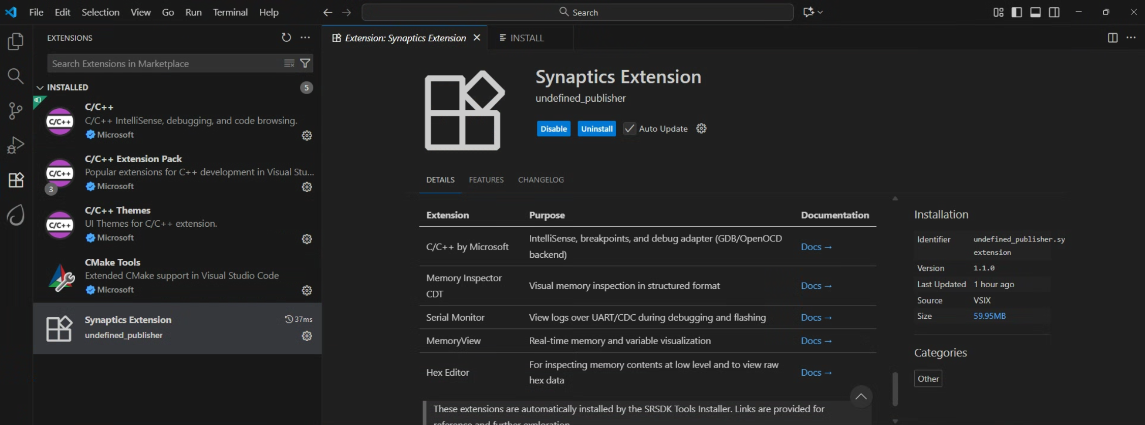 安裝完成後,您應該可以在「已安裝 (INSTALLED)」列表中看到 Synaptics Extension。該擴充功能提供了 C/C++ IntelliSense、偵錯工具、記憶體檢查、序列埠監控等功能。