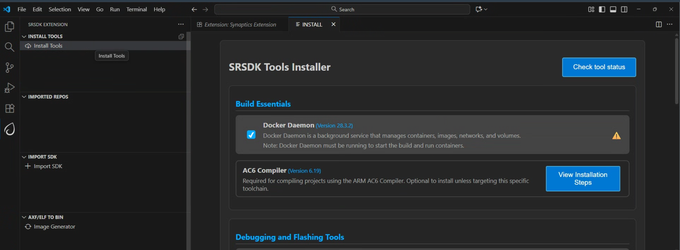 在 VS Code 中,進入 SRSDK EXTENSION 介面,找到 INSTALL TOOLS 區塊,點擊 Install Tools。您會看到 SRSDK 工具安裝程式頁面,其中列出了 Build Essentials (例如 Docker Daemon、AC6 Compiler) 和 Debugging and Flashing Tools。