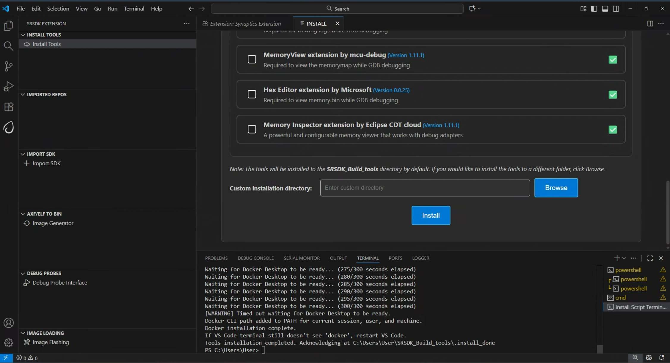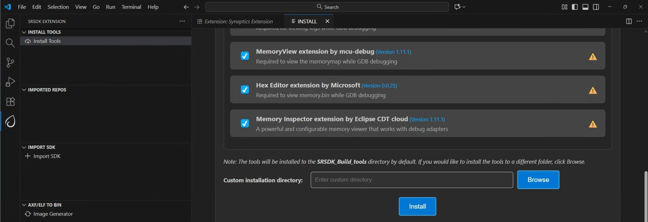滾動到頁面最下方,確認所需的工具(例如 MemoryView extension by mcu-debug、Hex Editor extension by Microsoft 等)已勾選,然後點擊 Install。工具將預設安裝到 SRSDK_build_tools 目錄。