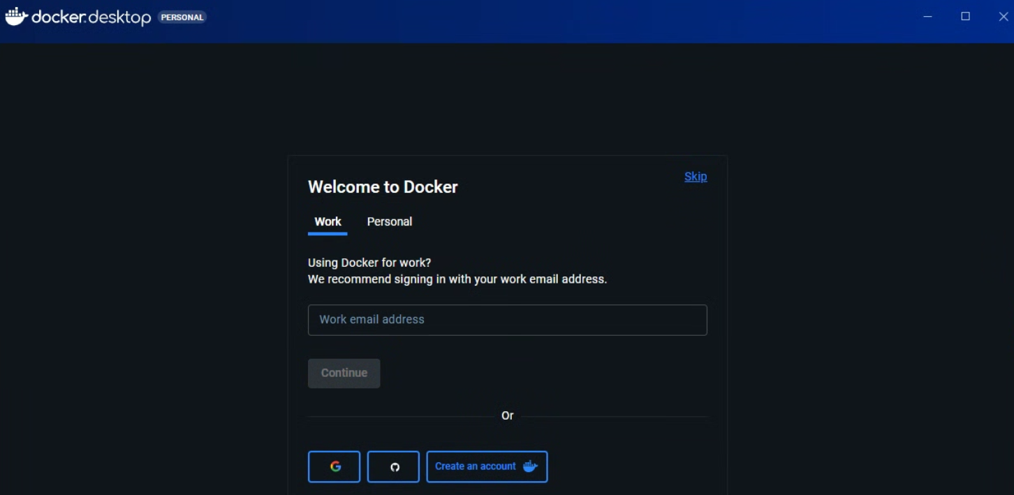 在安裝過程中,可能會彈出一些對話視窗,例如 Docker Desktop 的設定視窗。請依照指示完成必要的配置(例如登入或建立帳戶)。