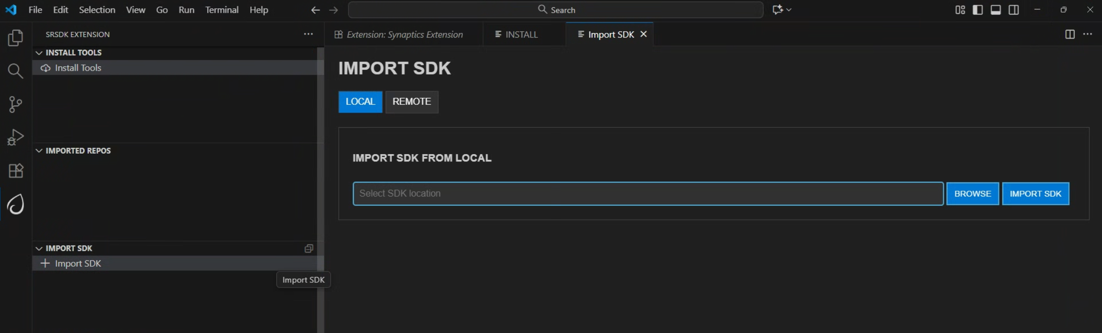 在左側欄位中找到 IMPORT SDK 區塊,點擊 + Import SDK。選擇 LOCAL 標籤,點擊 BROWSE 選擇您的 SDK 檔案夾位置,然後點擊 IMPORT SDK。