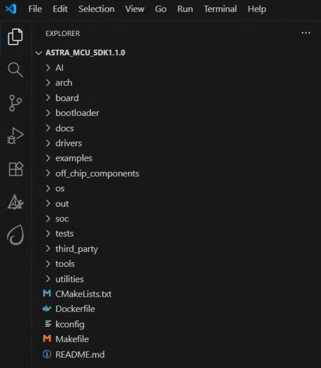 匯入成功後,在檔案總管 (EXPLORER) 中,您將會看到 SDK 的目錄結構,例如 ASTRA_MCU_SDK1.1.0,包含 AI、board、examples 等子目錄。