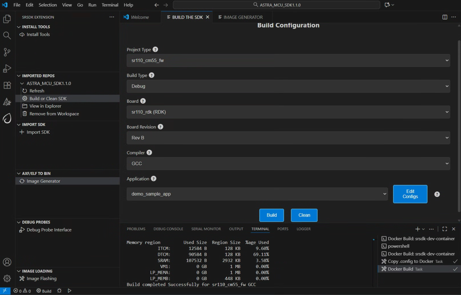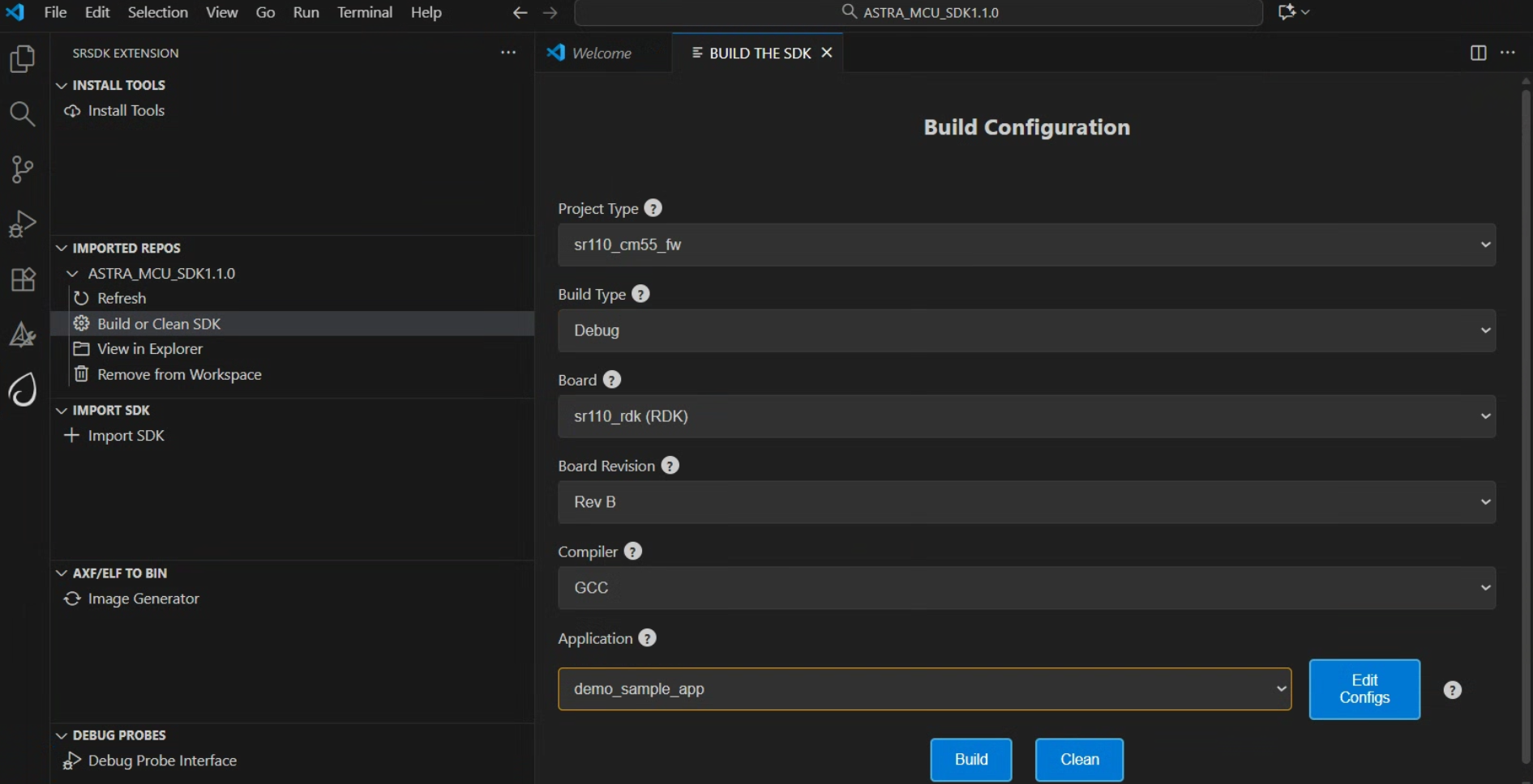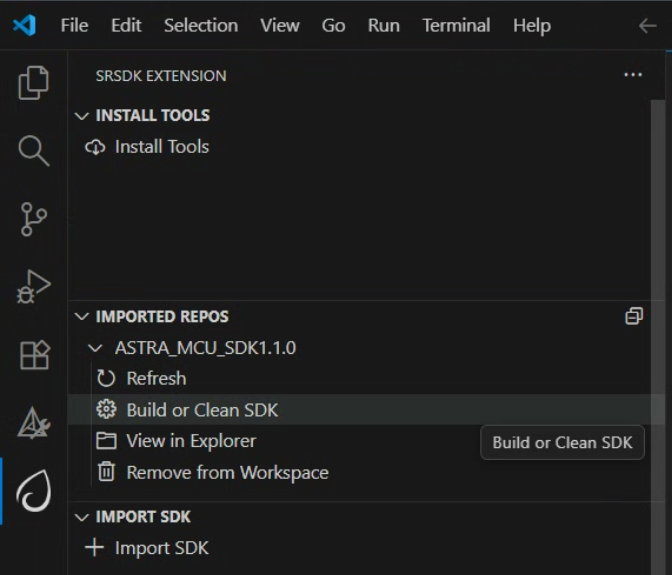 在 IMPORTED REPOS 下的 ASTRA_MCU_SDK1.1.0 項目中,選擇 Build or Clean SDK。