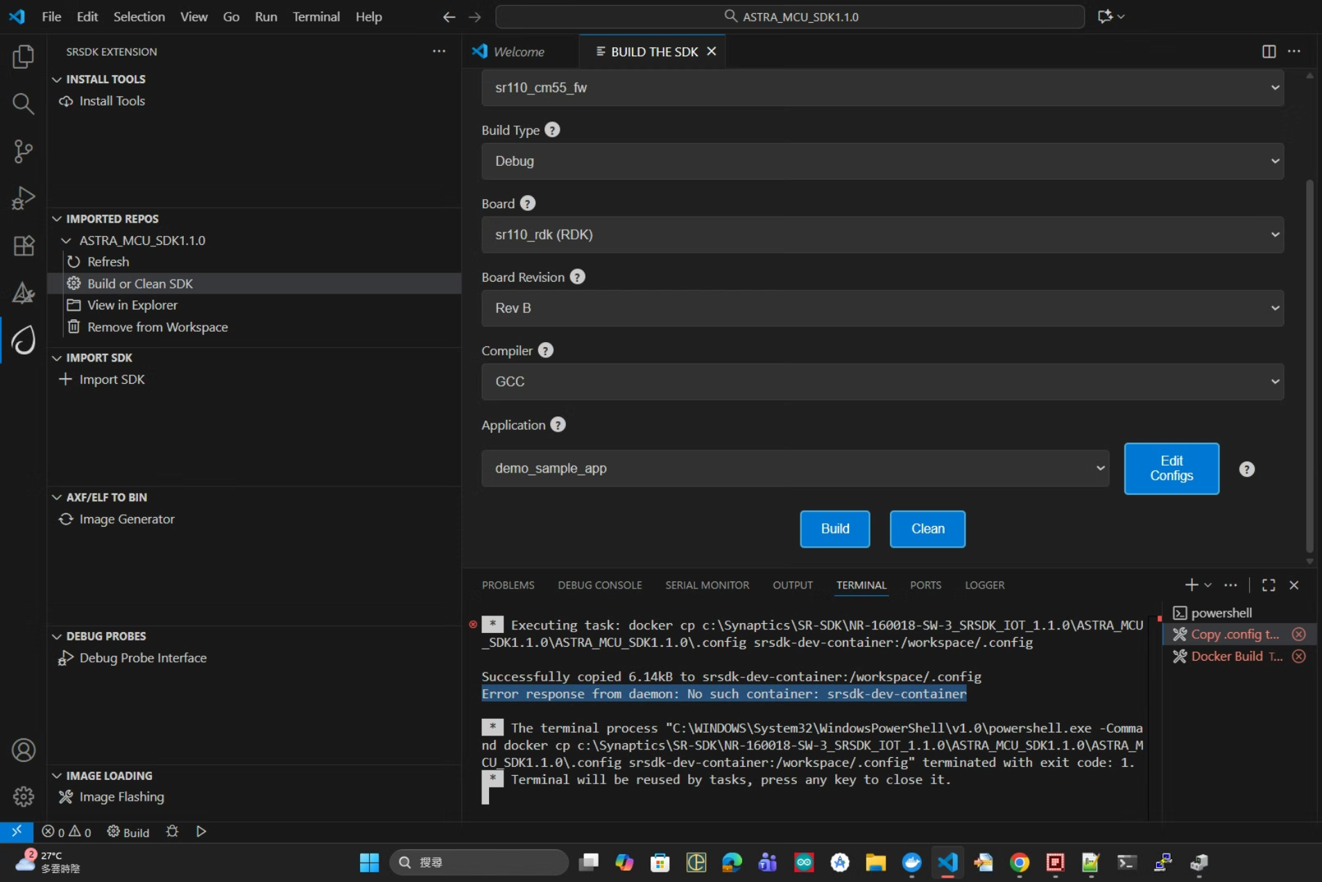 首次執行編譯時,您可能會在終端機中遇到 Docker 相關錯誤,例如:「Error response from daemon: No such container: srsdk-dev-container」。