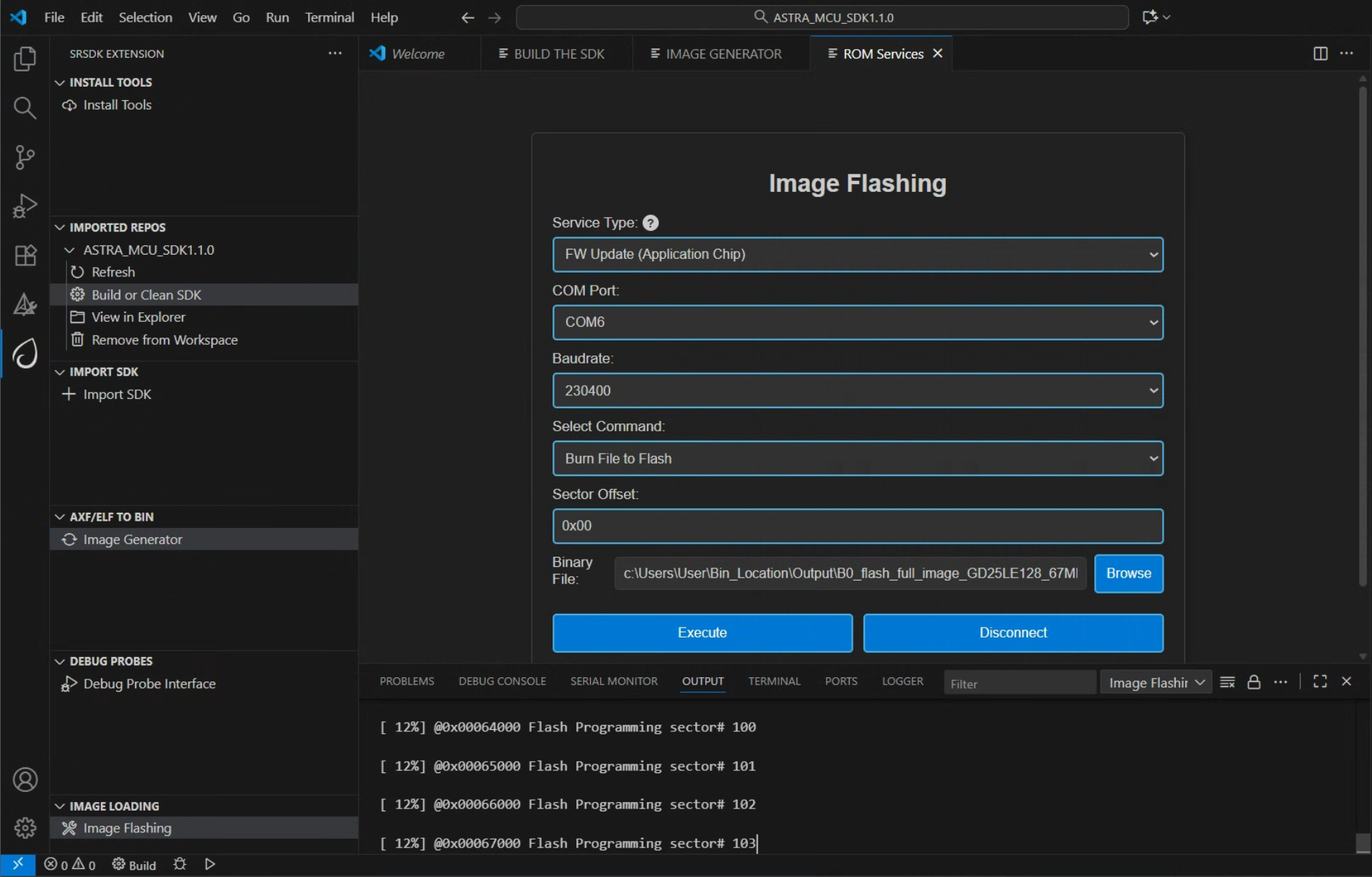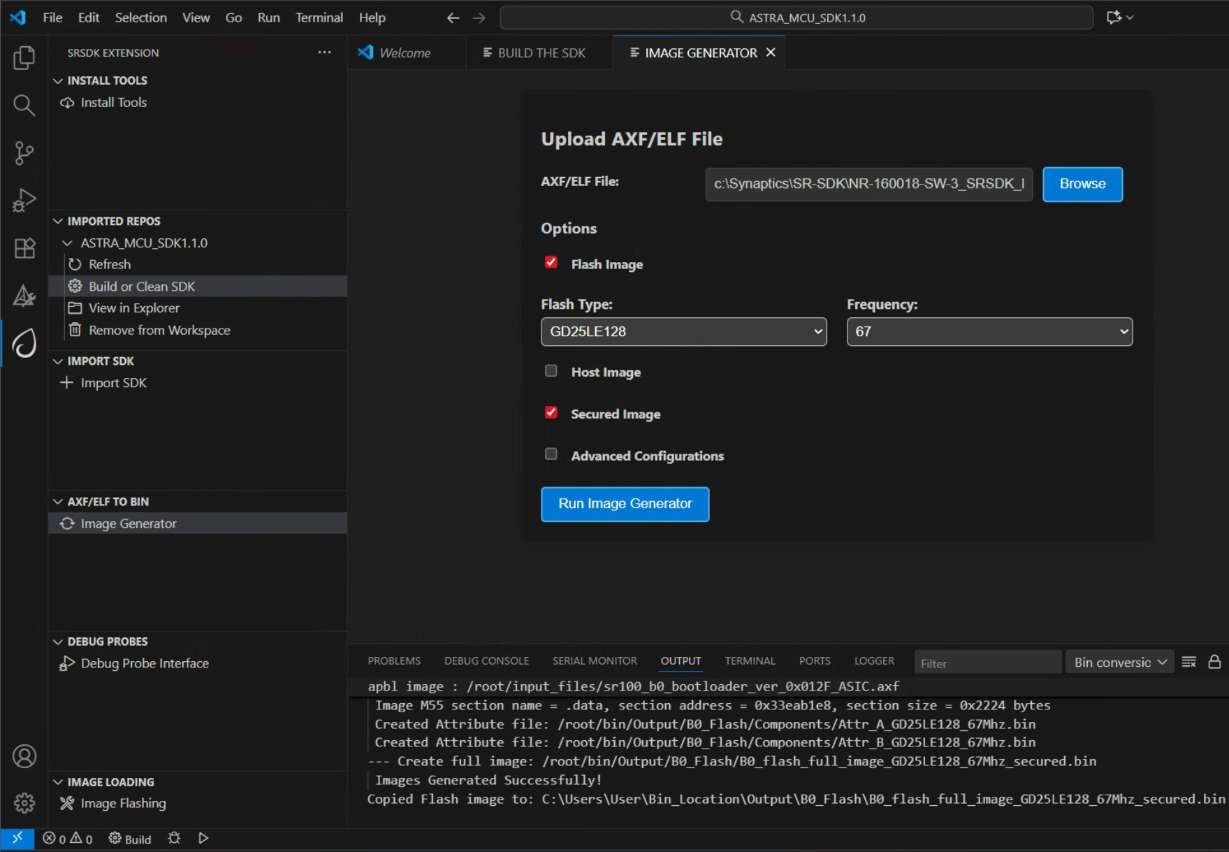 映象檔生成成功後,終端機將顯示輸出路徑,例如:「Copied Flash image to: C:\Users\User\Bin_Location\Output\B0_Flash\B0_flash_full_image_GD25LE128_67Mhz_secured.bin」。