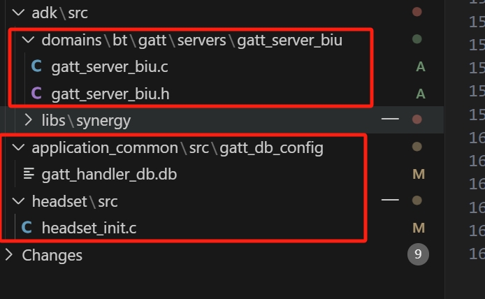 Finally, at the application layer, add calls to the library and handle them to implement a custom GATT service. The relevant file locations are shown in the figure below: