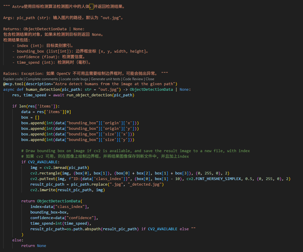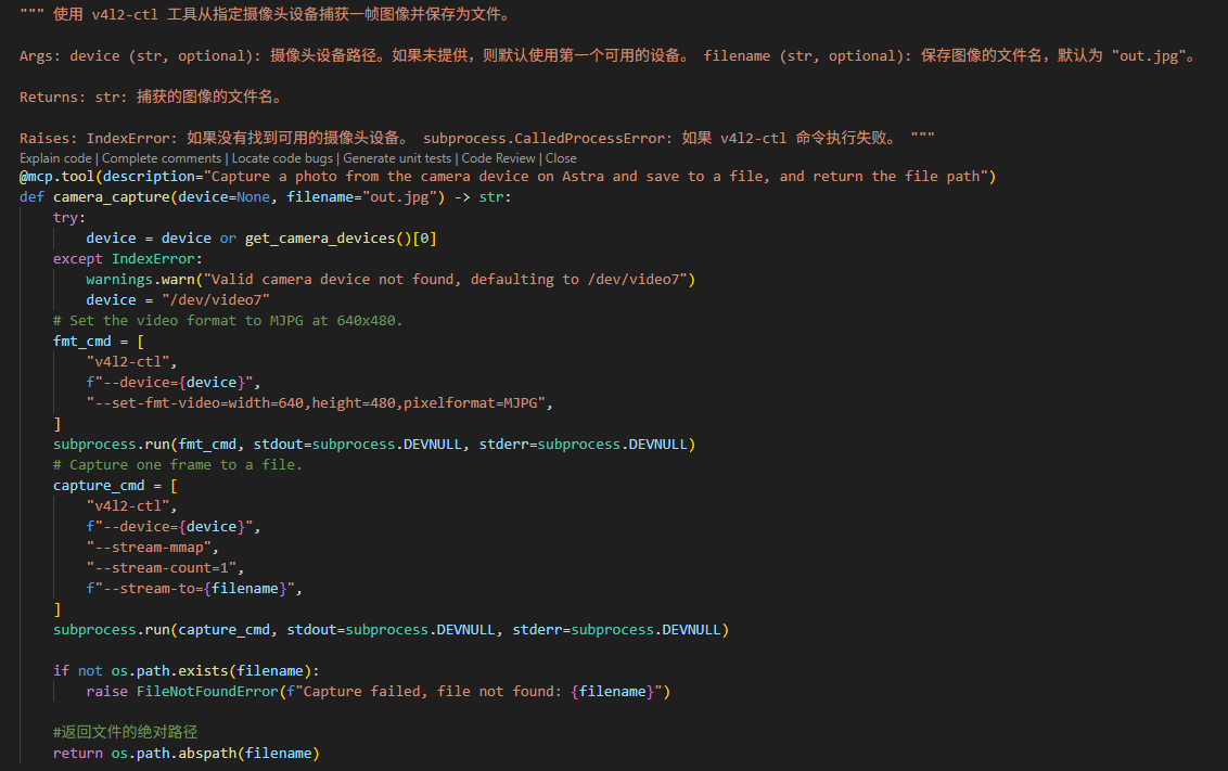 According to the introduction in the previous blog post, first run Astra's MCP Server. The edge capabilities (tools) are defined as two main functions: taking photos using a camera and recognizing people in the photos.