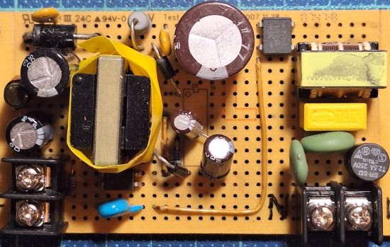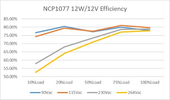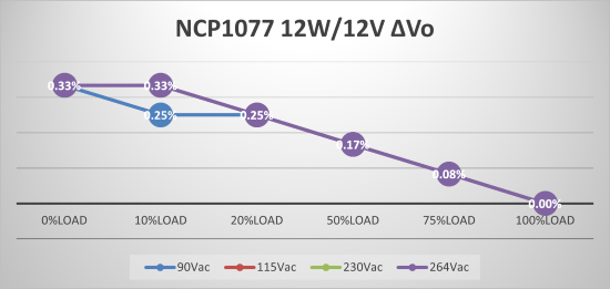 Today's topic focuses on the application of the onsemi NCP1077STAT3G for a 12V/12W auxiliary power supply. The main specifications are as follows: input voltage range is 90Vac~264Vac, full-load efficiency is greater than 75%, and output voltage variation must be controlled within 3%. The circuit diagram is designed based on the typical application circuit shown in Figure 3, using an EE22 core transformer. According to the BCM formula, the primary inductance of this 12V/12W transformer can be calculated, and here we use an inductance value of 1mH with a primary-to-secondary turns ratio of 6:1. This 12V/12W auxiliary power supply is assembled using readily available components, and the PCB is implemented on a prototyping board. The actual assembled product is shown in Figure 4. The actual full-load efficiency of the board is 77.97% at 90Vac, 79.63% at 115Vac, 78.84% at 230Vac, and 77.77% at 264Vac. Figure 5 shows the efficiency of this product under different input voltage and load conditions. The output voltage variation is a maximum of 0.33% at 90Vac, 0.33% at 115Vac, 0.33% at 230Vac, and 0.33% at 264Vac. Figure 6 illustrates the output voltage variation of this product under different input voltage and load conditions.