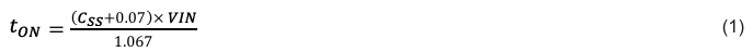 The AOZ18101DI features a soft-start function that controls inrush current during startup. It also includes a Safe Operating Area (SOA) control function, which protects the device by preventing the internal Metal-Oxide-Semiconductor Field-Effect Transistor (MOSFET) from exceeding its safe operating area. During startup, the voltage at the VOUT pin rises linearly to the voltage at the VIN pin over a period of time. This rise time is referred to as the soft-start time, typically measured in milliseconds. The soft-start time (tON) can be programmed by connecting an external capacitor CSS to the SS pin, thereby controlling the inrush current. The following formula can be used to estimate the time required for the voltage to rise from 10% to 90% of its final value.
