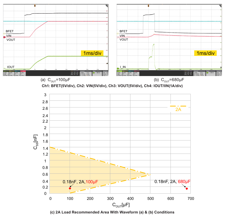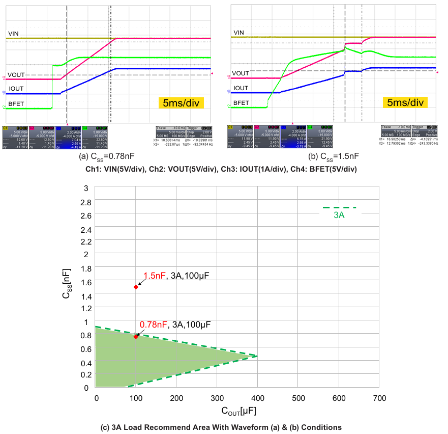 Figure 3 shows the startup waveforms under the conditions of an input voltage of 14V, an output capacitance of 100 µF, and a load of 3A, using two different CSS capacitor values. Figure 3(a) illustrates the normal startup waveform when CSS = 0.78 nF, as the CSS capacitor is within the recommended range shown in Figure 3(c). Figure 3(b) depicts the abnormal startup waveform when CSS = 1.5 nF, as the CSS capacitor exceeds the recommended range shown in Figure 3(c). In this case, the energy during soft start is large enough to damage the device. During the next startup process, the device will fail. Figure 3(c) highlights the recommended regions for CSS and COUT under a load current of 3A using different colors.