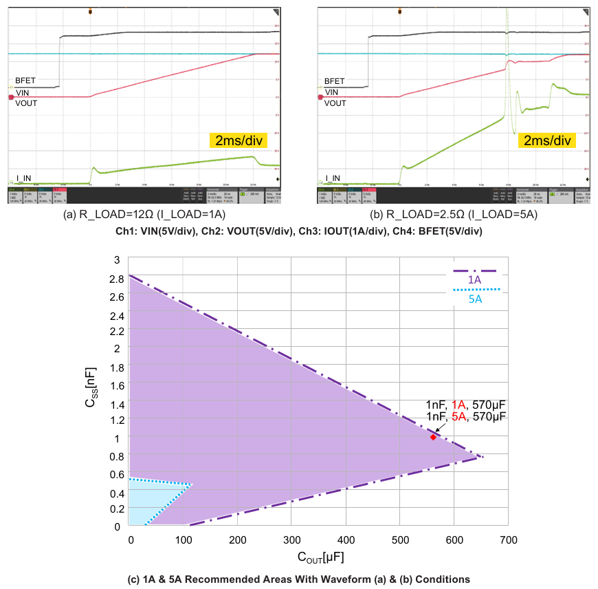 Figure 5 illustrates the startup waveforms under different resistive load conditions when the input voltage Vin is 12V, the output capacitance is 570µF, and the soft-start capacitor CSS is 1nF. Figure 5(a) shows the normal startup waveform, as the parameters of CSS and COUT fall within the recommended range for a 1A load. Figure 5(b) shows the abnormal startup waveform, as the parameters of CSS and COUT exceed the recommended range for a 5A load. During the next startup process, the device may be damaged. Figure 5(c) uses different colors to indicate the recommended regions for 1A and 5A load conditions.