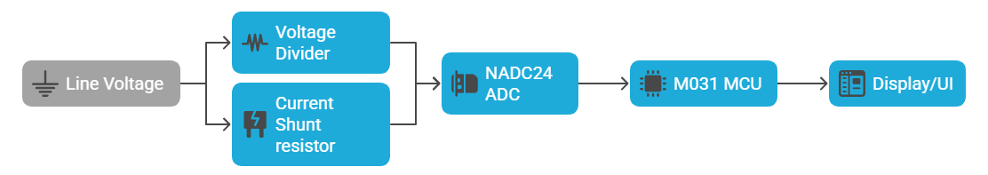 The line voltage and current signals of the power supply are scaled down using a voltage divider and a current transformer, respectively. These analog signals are input to the NADC24 in differential mode. The integrated programmable gain amplifier (PGA) enhances small signals before they are digitized by the Delta-Sigma ADC core. The digitized data is transmitted to the M031 MCU via the SPI interface. Subsequently, the MCU calculates various power-related parameters and updates the display/UI in real-time.