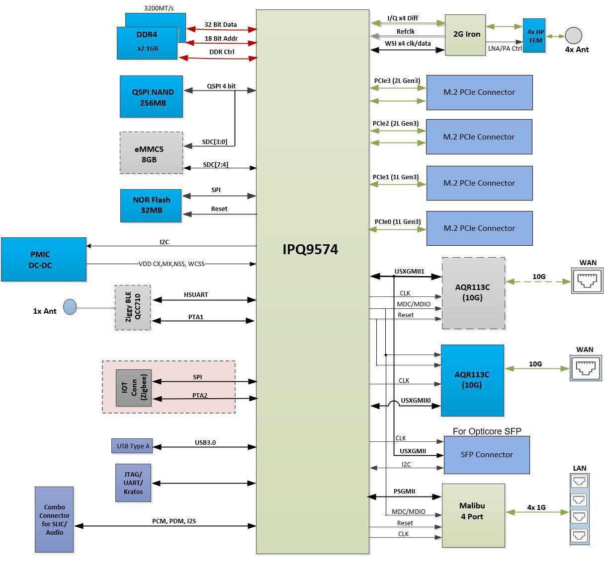 The design supports multi-band operation and connects to the wireless module via a PCIe Gen3 interface, ensuring high-performance data transmission. Additionally, the 2.4GHz 802.11ax Wi-Fi subsystem built into the IPQ9570 is disabled, further optimizing system resource allocation.