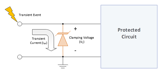 TVS二極管與受保護的IC並聯連接(圖2)。在正常工作條件下,TVS二極管會對被保護電路產生高阻抗。在電氣過應力(EOS)事件期間,一旦電壓超過TVS擊穿電壓,該設備就會“開啟”並變為低阻抗路徑,以將瞬態電流分流到地。該電流被定義為“峰值脈衝電流”。在指定的峰值脈衝電流下,器件兩端產生的電壓就是箝位電壓。箝位電壓必須低於被保護IC的故障電壓。 TVS製造商竭盡全力開發降低TVS箝位電壓同時保持高峰值脈衝電流處理能力的技術。