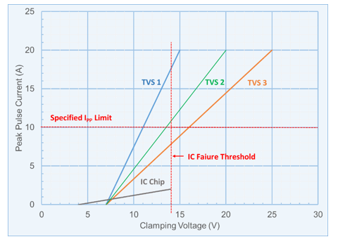 在一個實際示例中,請考慮如圖4所示的峰值脈衝電流與箝位電壓IV特性曲線。在該示例中,考慮了選擇TVS二極管的三個選項(TVS 1,TVS 2和TVS 3)。要保護的IC的故障電壓為14V,根據IEC61000-4-5的要求,該應用需要10A的浪湧測試電流。這意味著,為了保護IC,對於10A及以上的峰值脈衝電流,TVS的箝位電壓應低於14V。每個TVS器件都具有大約7V的相同擊穿電壓,並且根據IEC 61000-4-5的額定最大峰值脈衝電流為20A。對於20A脈衝(PPP = 20A * 15V),TVS 1的PPP額定值為300W,對於20A脈衝(PPP = 20A * 20V),TVS 2的PPP額定值為400W,最後TVS 3的PPP額定值為500W對於20A脈衝(PPP = 20A * 25V)。 TVS 1設計為具有較低的箝位特性,並且直到該器件執行的IPP為17A(遠高於10A的要求)時,才達到14V的IC故障電壓。 TVS 2直到11A以下才達到14V箝位。從理論上講,該器件可以保護IC,但是設計裕度很小。 TVS 3以約7A的IPP箝位在14V。換句話說,由於較高的箝位特性,即使TVS保持不變,10A脈衝也可能損壞IC。在這種情況下,TVS 1(300W)是最佳解決方案,儘管與TVS 2(400W)和TVS 3(500W)相比,峰值脈衝功率額定值較低。