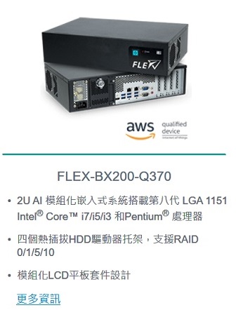 TANK AIoT Dev. Kit 擁有豐富的I/O和雙槽的PCIe x8 支援附加裝置,而FLEX-BX200則是擁有雙槽的PCIe 3.0 x8 與 PCIe 3.0 x 4可依需求自主彈性擴充,如Mustang 系列加速卡,其高效能、低功耗的特點能有效提升運算效率。