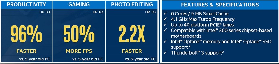 從官方發布的數據來看,採用酷睿i5-9400F處理器的電腦和5年前的產品對比,產品性能提升96%,遊戲性能提升50%,照片編輯性能提升2.2倍。和Intel 300系列晶片組搭配使用,包括市面上的H310,B360,Z370,Z390等主板。同時也支持新的Intel Optane Memory,Intel Optane SSD和雷電三技術等。
