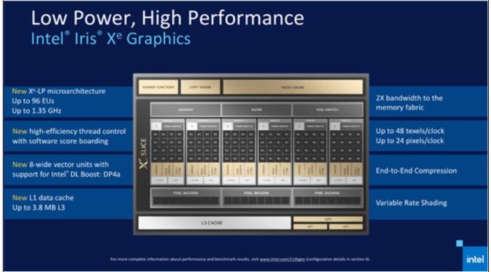 GPU核顯部分則是全新的Xe LP,這也是Xe架構首次登場,屬於低功耗版本,最多96個EU執行單元,增加一半,性能提升則最高可達2倍,並支持深度學習加速指令DP4A,可加速AI應用。