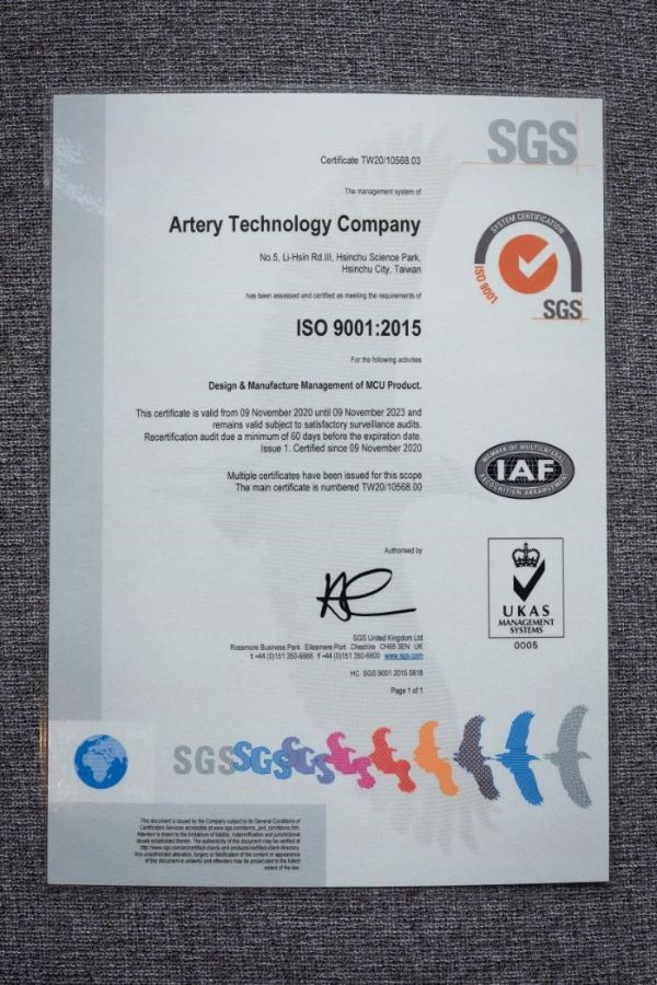 產品品質是企業的生命,也是企業的命脈和靈魂。雅特力作為32位微控制器的創新領導者, 自2016年成立至今,一直秉承品質第一的方針,在2020年將ISO 9001品質管理體系引入到企業管理中,全面系統地實現全過程品質管理。將品質管理滲透到產品的研發、製造、銷售、技術服務等各個方面,各部門嚴格按照公司的品質方針執行。在公司全力投入品質管理系統的帶動下, 通過組織培訓、學習、研討會議等形式,經過縝密的準備工作與徹底實做,逐步架構合宜的公司品質體系並持續精進完善,因此順利按計畫時程獲得了國際ISO 9001:2015發證權威機構UKAS(英國皇家認證委員會)的證書認可。