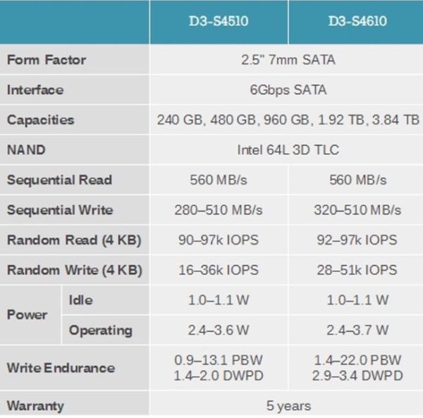 Intel SSD S4510和S4610屬於D3系列,轉為數據中心設計,基於Intel 64層3D NAND TLC,存儲容量從240GB到3.84TB不等,寫入壽命最高每天2.0次、3.4次全盤寫入,終生最大寫入量13.1PB、22.0PB,質保5年,採用標準2.5英寸和M.2外形。SSD S4510和S4610大容量驅動器的功耗和冷卻僅為2.5英寸HDD的1/6,還可在相同的空間內存儲3.2倍的數據。因此客戶可以選擇Intel SSD替代HDD,降低存儲運營成本,並通過高能效性能加速讀密集型工作負載,在保留傳統基礎架構的同時實現更高效的存儲。通過高能效性能加速讀密集型工作負載將SSD集成到環境中以提高服務器靈活性,IOPS/TB4比HDD高300倍。