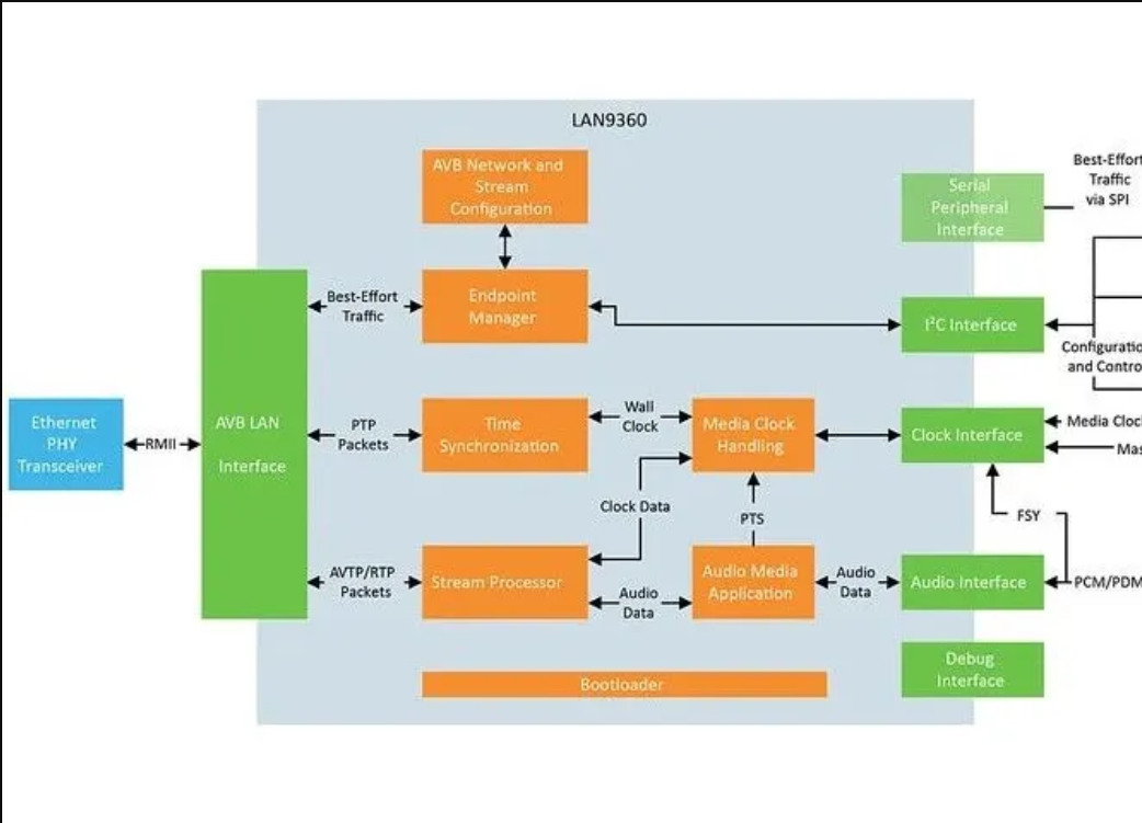 Microchip的LAN9360音頻端點控制器通過以太網AVB實現車輛信息娛樂設備(包括揚聲器、放大器、麥克風、導航系統、無線電調諧器和智能頭枕)互連。LAN9360在以太網AVB和Inter-IC Sound(I2S™)、時分復用(TDM)和脈衝密度調製(PDM)本地音頻接口之間橋接音頻。它全面支持通過以太網AVB進行音頻傳輸,包括通用的精確時間協議gPTP、時間戳、傳輸協議和高帶寬數字內容保護(HDCP)的內容保護。它還支持通過以太網進行安全啟動和安全遠程更新。與其他需要系統級晶片(SoC)單片機(MCU)和第三方軟體協議棧的以太網橋接網絡解決方案不同,LAN9360端點設備不需要軟體集成,使設計人員能夠根據製造商獨特的音頻和網絡要求簡單、快速地配置設備。