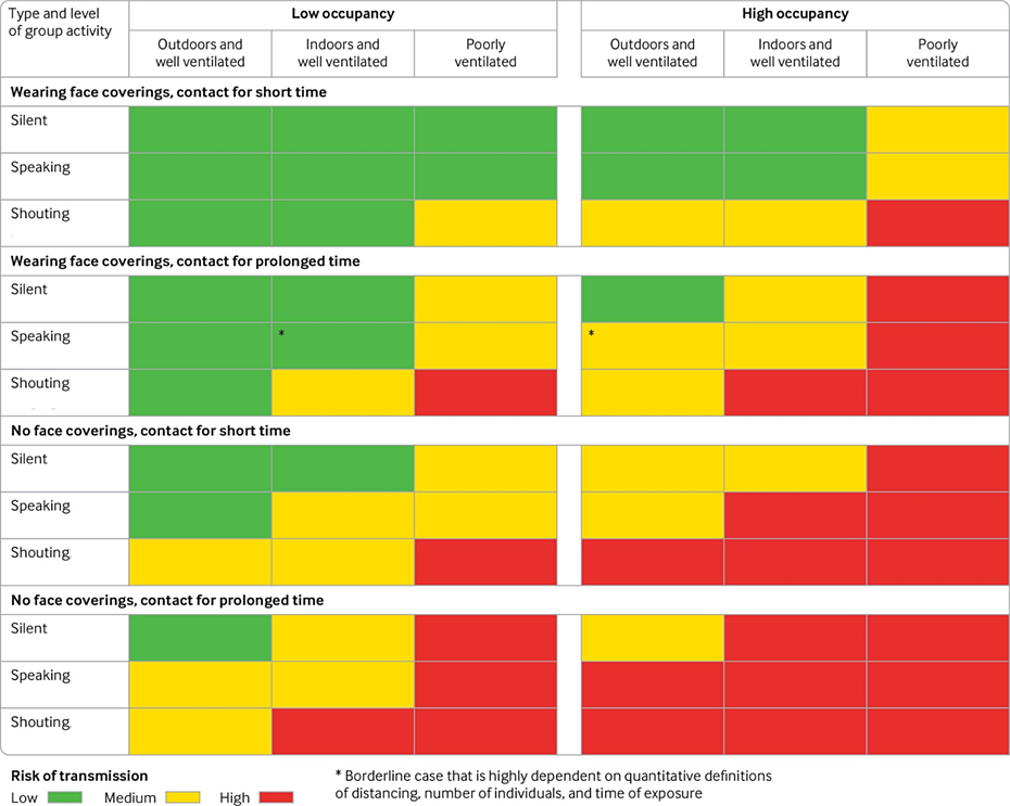 下表提供了有關傳播風險如何隨設置,佔用水平,接觸時間以及是否戴上臉罩而變化的指南。
