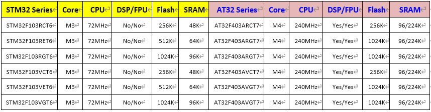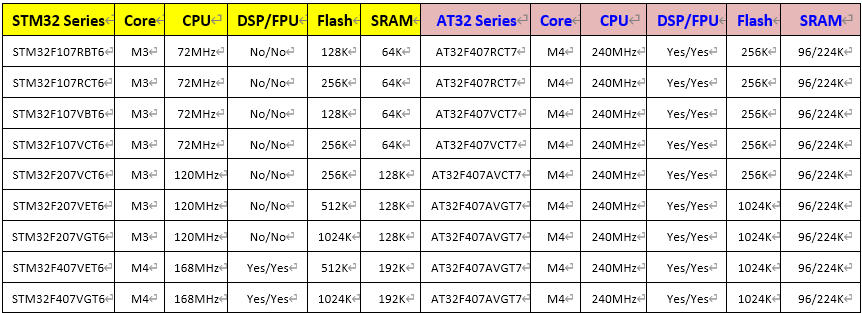 表二: AT32F407/407A和STM32F107/207/407主要資源對照表