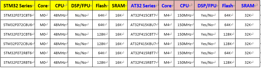 雅特力(Artery)的AT32F415系列,其產品硬體引腳與STM32 P2P相容,軟體更是高度相容,可批量替換STM32 F051,F072等系列,也由於內核、CPU速度、SRAM、外設等性能相比STM32大幅度提升。F415具有USB OTG功能,並提供了迷你型最小封裝為QFN32(4x4 mm),特另適合一些有PCB空間面積限制的應用,如手持雲臺,遊戲手柄等。另外還有自主研發獨有安全保護與二次開發功能sLib(security Library),以及工業級的操作溫度-40~105度。