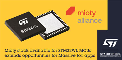 意法半導體加入Mioty規範管理和技術推廣組織Mioty聯盟,同時發佈了ST授權合作夥伴Stackforce開發的協定棧,讓客戶可以使用STM32WL無線系統級晶片 (SoC) 開發Mioty設備。