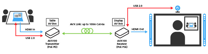 如下圖所示,可以將基於AVX100的顯示AV盒設計為連接高清或4K顯示器以及1080p USB攝像機,還可以選擇提供到牆壁或天花板揚聲器的音頻連接。同樣,與IcronExtremeUSB®設備配對可提供無縫連接,並擴展了最高質量的USB 2.0會議攝像機。通過將顯示AV盒設計為PoE電源發送設備(PSE),AV桌子可以通過AVX Link完全供電,從而無需在會議室桌子上進行其他電源連接。