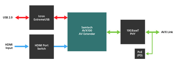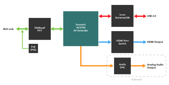 對於提供最低端到端延遲性能的,最具成本效益的基於AVX的BYOM AV擴展解決方案,Semtech的AVX100 AV Extender可用於在100m的Cat-6a標準銅纜佈線中傳輸多達4K60的視頻。對於狹小的雜物間,較短的電纜距離就足夠了,可以使用成本較低的Cat-6甚至Cat-5e電纜。為了實現USB 2.0的完整480Mbps傳輸,將AVX與Icron Technologies的ExtremeUSB®設備配對,如下圖所示。如此低的組件數量和低功耗操作,可實現緊湊,時尚的AV盒設計,實現台式機AV連接,包括嵌入式安裝的彈出式AV控制台。