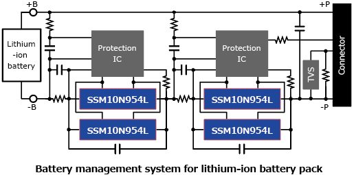 鋰離子電池組採用高強的保護電路來增強安全性。此外,還需要減少鋰離子電池充/放電時的發熱。這種保護電路要求低功耗、高密度安裝,因此需要小且薄的低導通電阻MOSFET產品。