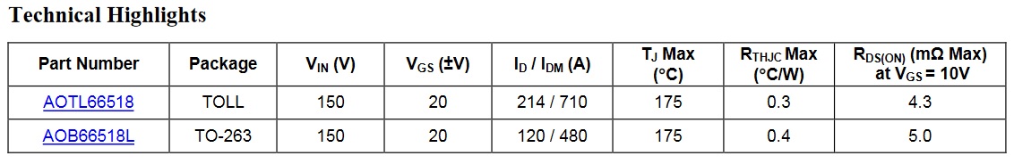 AOTL66518 採用 TOLL 封裝的 150V MOSFET 以提供高穩健性。 TOLL 封裝的佔位面積比 TO-263 (D2PAK) 封裝小 30%,並且由於採用了夾子技術,因此具有更高的電流容量。 與TO-263相比,AOTL66518從矽結到封裝底部的熱阻(Rthjc)非常低。 這些特性使電信設計人員能夠減少並聯 MOSFET 的數量。