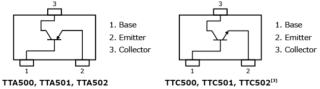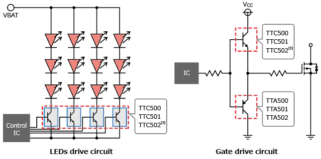 東芝電子元件及存儲裝置株式會社(“東芝”)推出五款車載雙極電晶體產品用於MOSFET柵極驅動電路和汽車背光燈的LED驅動電路及其他應用:TTA500, TTA501, TTA502, TTC500 和 TTC501。他們使用相容度很高的SOT-23F[1]封裝來降低集電極功耗。 該產品線包括集電極-發射極額定電壓為-50 V至50 V和集電極額定電流為-2.5 A至2.5 A的產品。