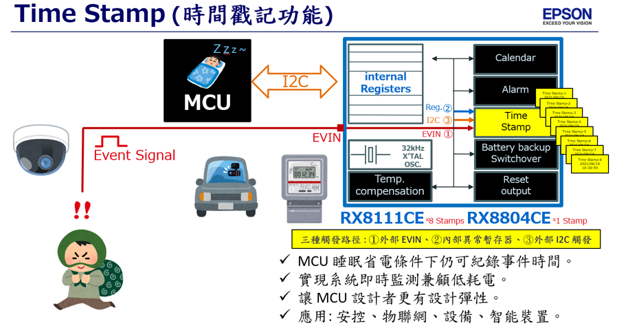 - 省電: 事實上microcontroller內建RTC或是外部RTC IC加768kHz石英晶振都可以做到時間戳記,但microcontroller必須在工作模式下動作,且還需要預留一條GPIO觸發啟動,耗電程度和腳位使用數都會增加,若是產品對於省電非常要求就較不適用。而愛普生支援時間戳記的RTC模組,可讓microcontroller處在完全休眠狀態,甚至完全失效狀態也能執行時間戳記功能。以RX8111CE為例,第十根腳EVIN可觸發高準位或低準位的輸入訊號,觸發後啟動RX8111CE時間戳記。