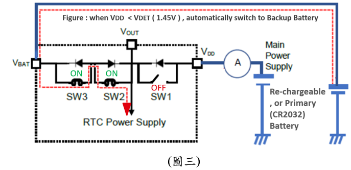【應用情境】當備用電池為不可充電的一次電池(如CR2032),偵測主電