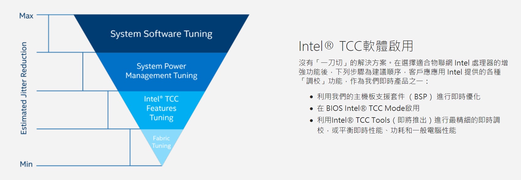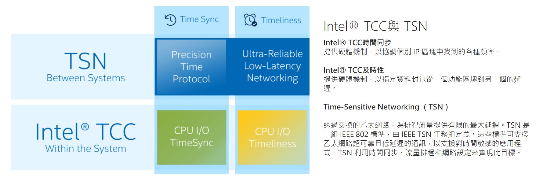 Intel 即時技術支援需要在網路裝置內部與跨網路高度協調的新解決方案。Intel® Time Coordinated Computing (Intel® TCC) 處理器為即時應用程式提供優化的 。使用採用 IEEE 802.1 Time Sensitive Networking (TSN) 的整合式或獨立乙太網路控制器,這些處理器可支援複雜的即時系統。