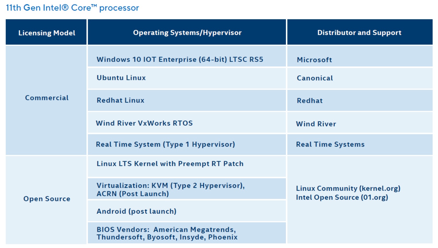 - Windows 10 IoT Enterprise LTSC、Linux Kernel LTS、VxWorks、Android • 具有改進實時性能的管理程序:KVM 和 RTS