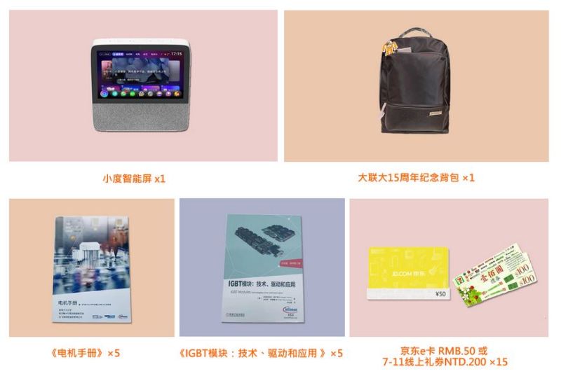 現在 預約報名 即有機會贏得 大聯大15周年限定背包、小度智能屏、電機手冊、IGBT模塊技術驅動和應用冊、電子禮券 等幸運好禮,趕緊行動吧!