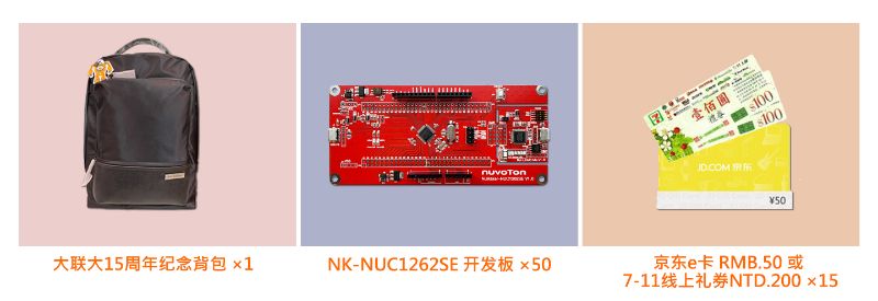 現在 預約報名 即有機會贏得 大聯大15周年限定背包、NK-NUC1262SE 開發板、電子禮券 等幸運好禮,趕緊行動吧!