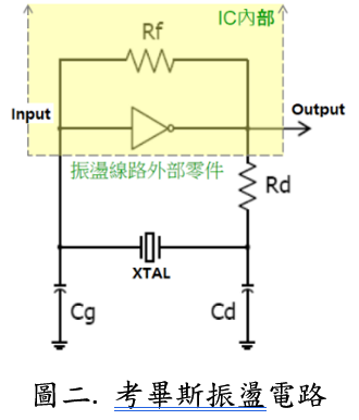 目前最常見設計為考畢斯振盪電路(參閱圖二),其電路本身的電子元器件需求最精簡、穩定性高、周邊所需電子元器件取得方便,常運用在石英振盪電路設計上。