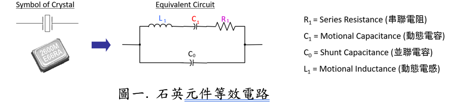 傳統石英晶體諧振器(下石英元件)是電子產品中不可或缺的頻率控制元件,可產生及穩定電子電路所需的工作頻率,因應目前資訊、通訊產業、車用、工業控制的各類應用產品,更是無法取代的頻率穩定元件。一般使用者來說,選擇石英元件以成本考量為第一要件,但本文並非鼓勵以此項為首要條件,建議以市場主流尺寸、晶片設計方式、電極面設計導電材料(鍍金)、頻率穩定度與可靠度為主(參閱下圖一. 石英元件等效電路暨相關參數名),取得高品質石英元件後,依照搭配主晶片選擇適合石英晶振負載電容值,再進行振盪電路迴路匹配調整其頻率精準度、驅動功率、負性阻抗特性,並符合整體系統搭配應用。其相關內容如下: