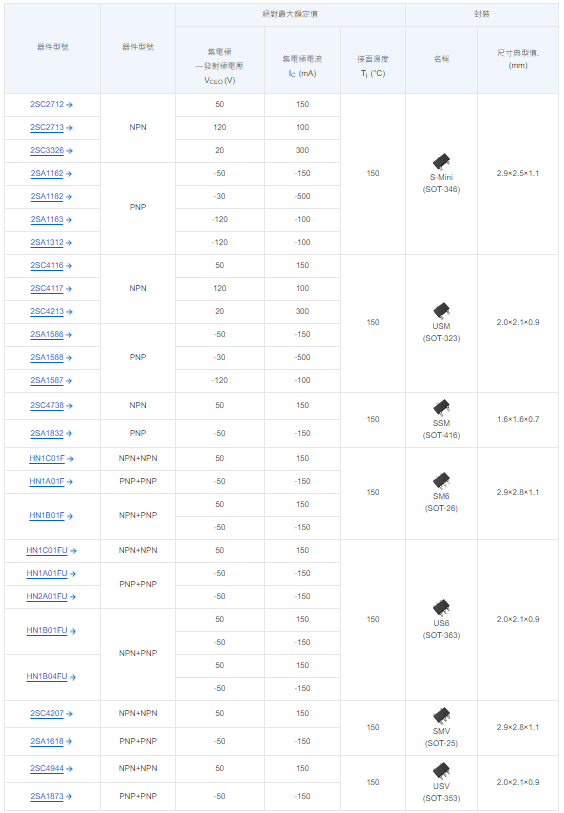 [1] 對象封裝 : S-Mini (SOT-346), USM (SOT-323), SSM (SOT-416), SM6 (SOT-26), US6 (SOT-363), SMV (SOT-25), USV (SOT-353)